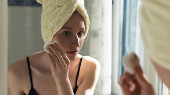 Woman looking at and touching face in the mirror 2